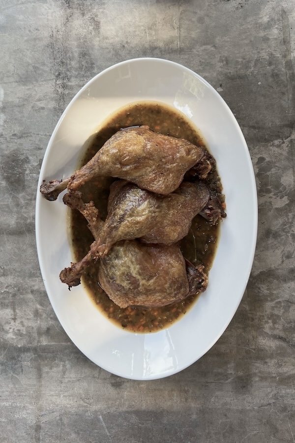 chinese new year cooler. farm made yee sang platter. grilled mackerel with pickled cape gooseberries. confit duck leg with nutmeg jam. roast pumpkin honey and nuts. charred red pepper anchovy and lemon basil. cucumber salad. twelve leaf & herb salad. lemon water celery rice. something sweet. coffee & tea.